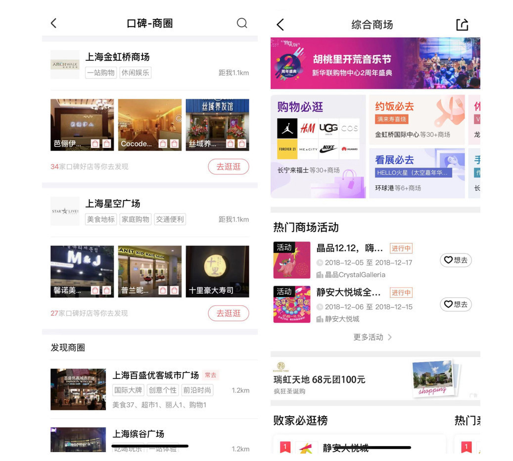 左:口碑的商圈频道首页;右:点评商场频道首页
