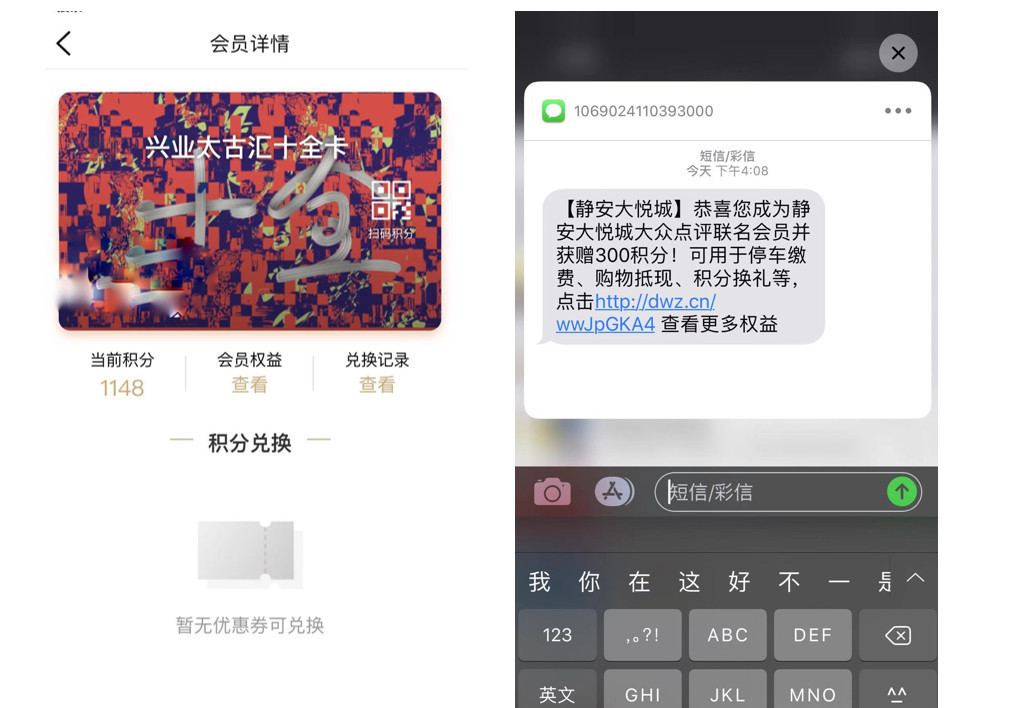 左:点评界面我的积分界面与商场积分同步;右:通过点评引流成为商场会员新用户