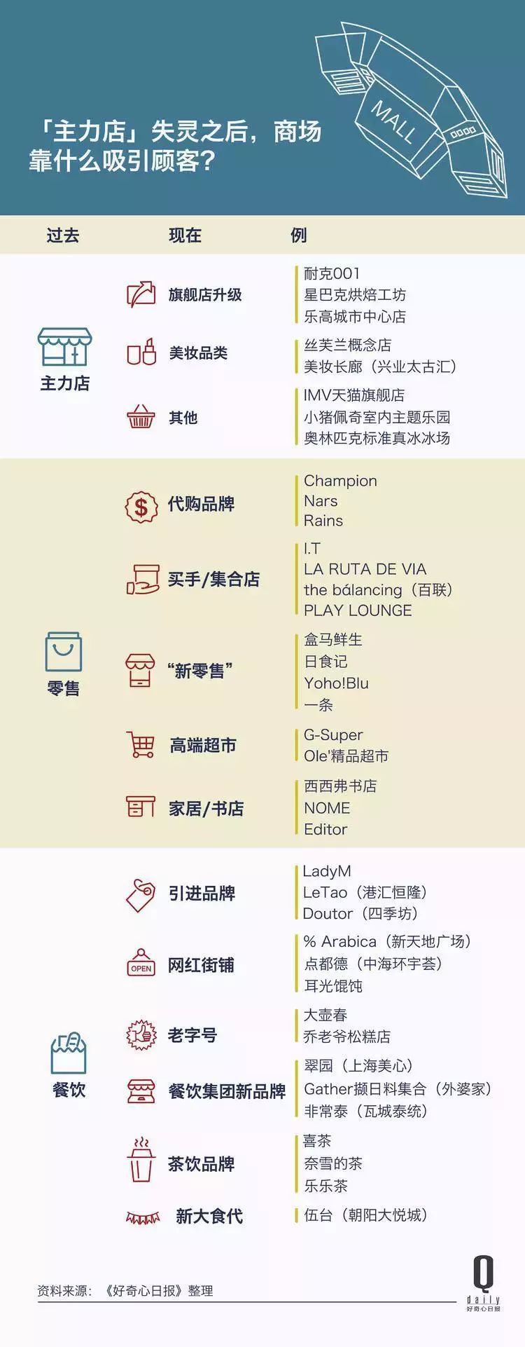 “主力店”是一个购物中心引流的最重要的部分之一。过去扮演主力店角色的商户不多,多为知名连锁餐饮、零售品牌、影院等,而主力店选择对象不多恰恰是近几年商场“长得差不多”的主要原因之一。