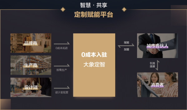 随着市场需求的不断增加,不少互联网公司与传统成衣品牌都瞄准了服装定制市场。无论是上门量体还是店面量体,都需要大量培养专业量体师,产生大量人力、交通费用,加之拓店成本高居不下,获客难、消费频率低、运营成本高已成为公认的行业痛点。即便是生产厂商,也同样存在着市场渠道少、市场需求与生产脱节等问题。大象定智的全新的商业模式,正是把个性化定制和智能生产相融合,为B端对接市场订单,通过消费者订单数据无缝对接缩短生产销售周期,帮助B端降低获客和渠道成本,用零成本拓店来摆脱赢利困境。